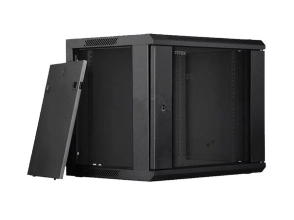 The Toten 9U Wall Mount Rack, built specifically for a small or home data network, provides for the installation of equipment such as switches, routers, firewalls, and network video recorders (NVRs). The Toten 9U 600×450, Wall Mount, single Section, the front door is a tempered Dark Blue glass door with a Push-lock, + 2 fans, 2 fans will aid in temperature regulation within the rack. 1 x PDU (UNIVERSAL 6 PORT)+2 x L style+removable side Panel assortment of: (25 cages, 25 nuts, 25 screws, 25 washers) 1.2 mm thickness.